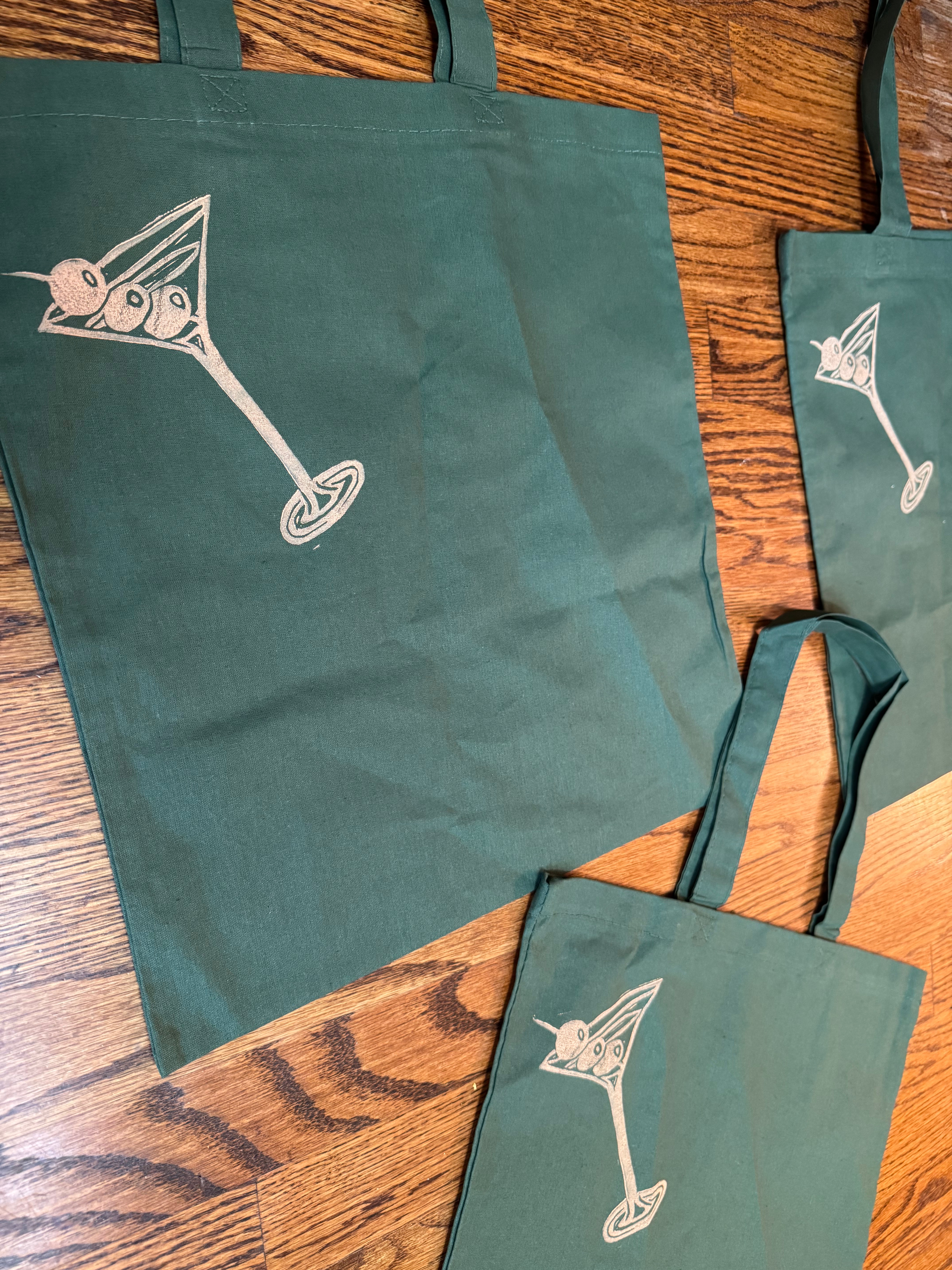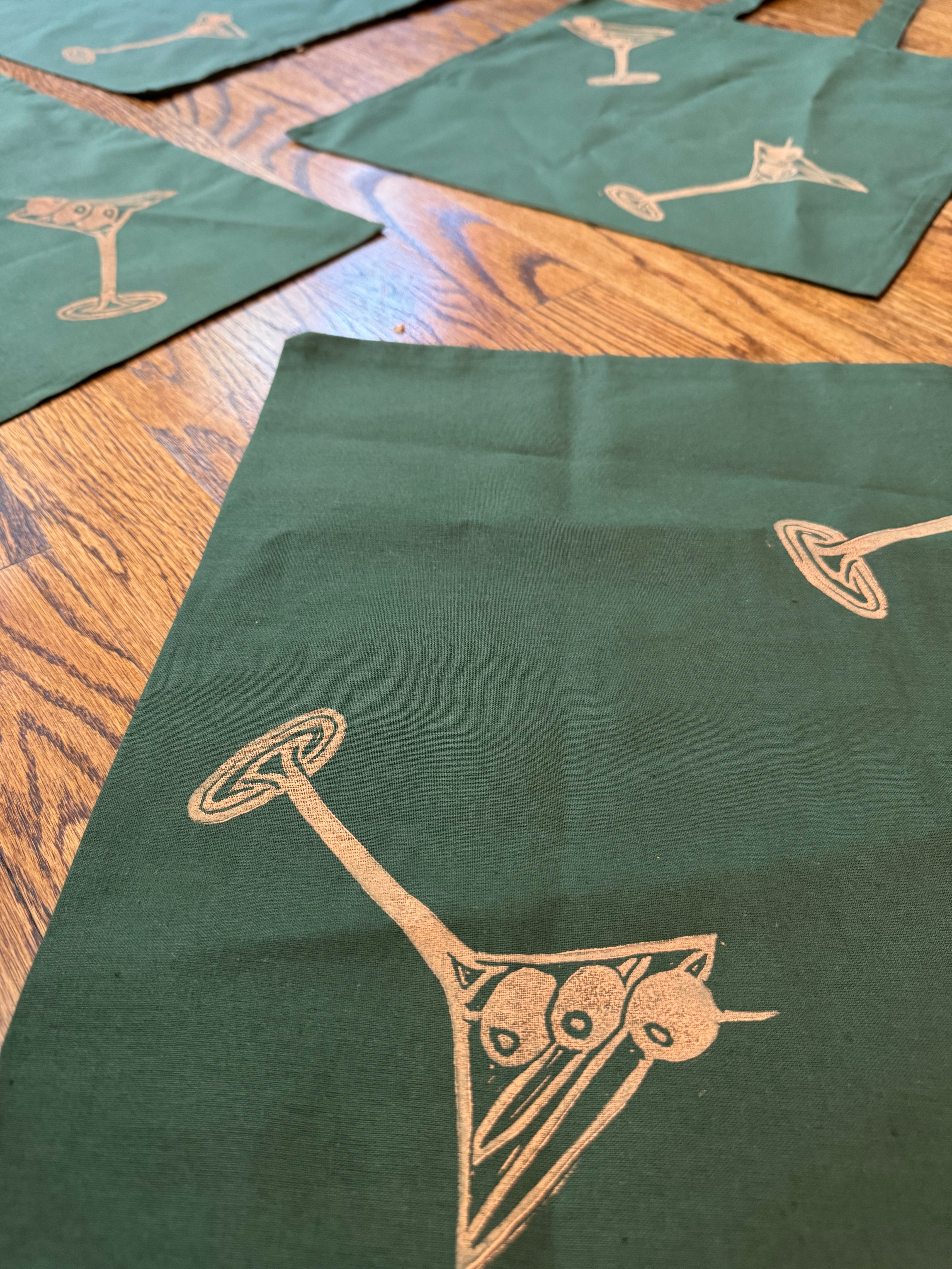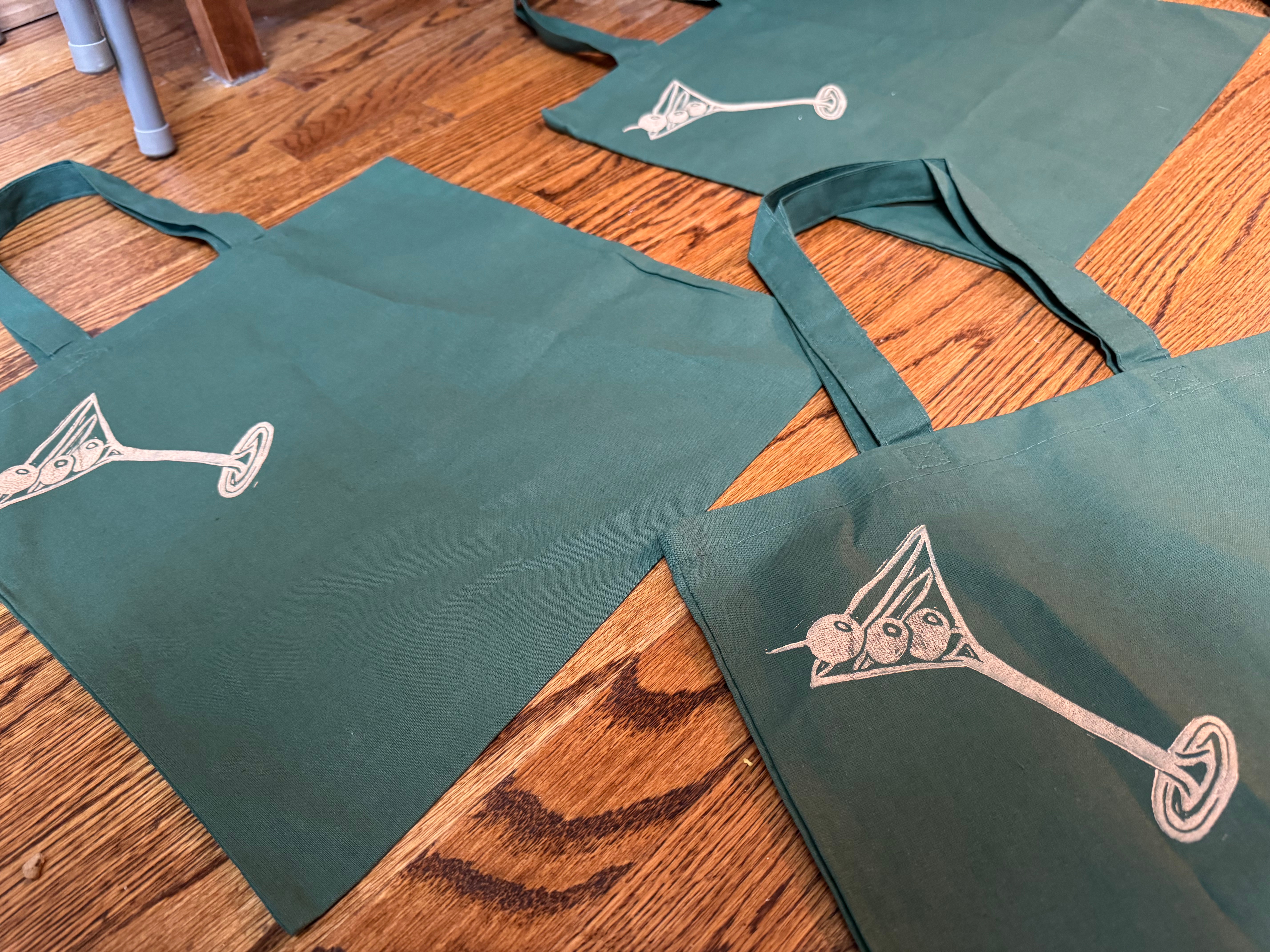a classic dirty martini linocut, printed on gift bags